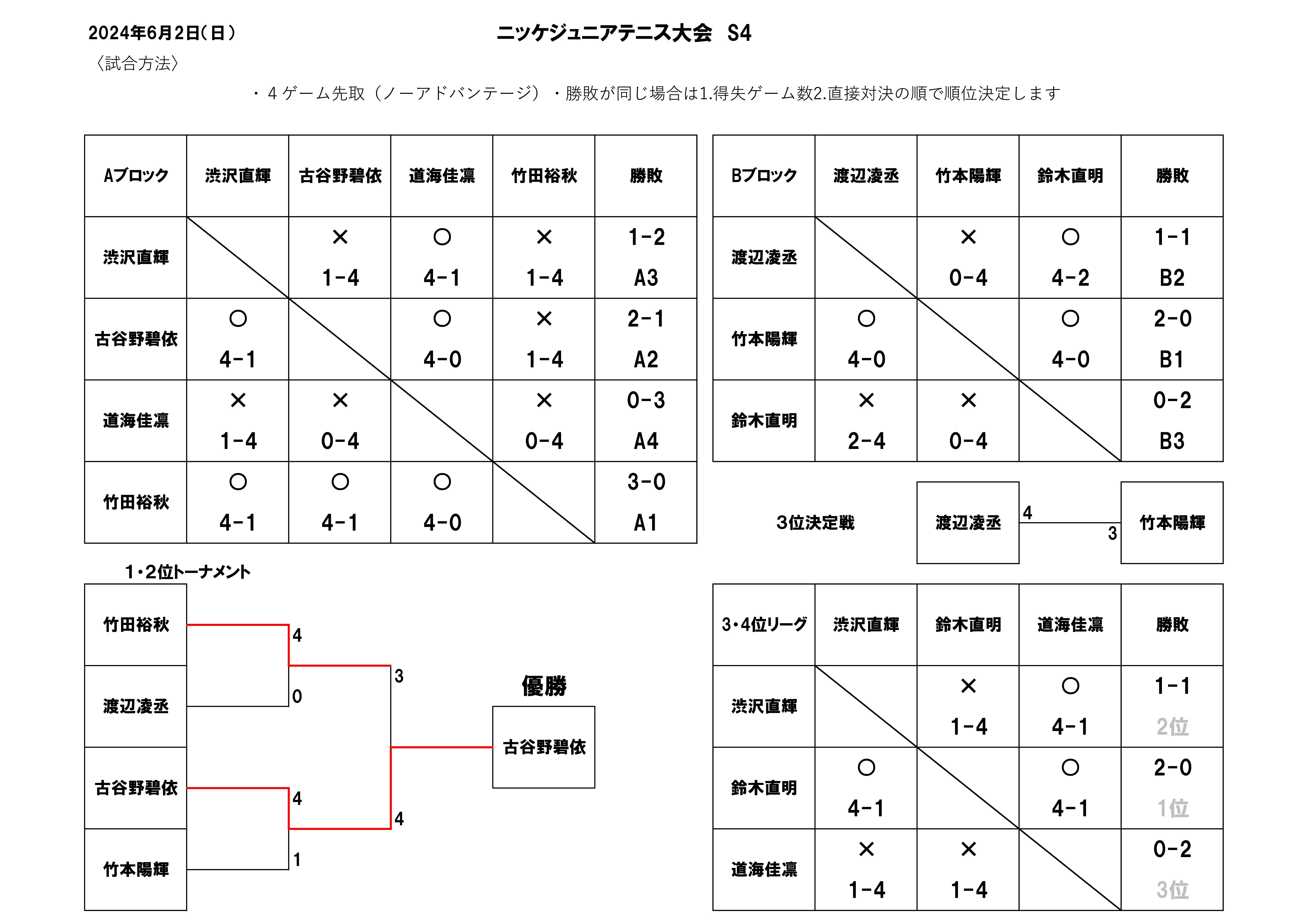 イベント結果 6月2日(日)開催!ニッケジュニアテニス大会 S4の部 2024年06月03日 « 6月30日(日)日曜テーマレッスン『完全スイートエリア』 6月2日(日)開催!ニッケジュニアテニス大会 S5の部 »